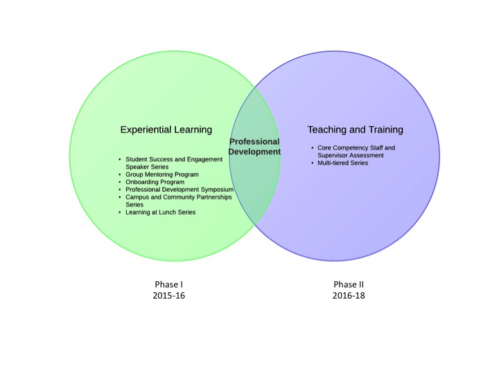 With the mission in mind, the KC focused on two principles that formed the basis of the program: Jillian Kinzie’s (Associate Director, Center for Postsecondary Research & NSSE Institutte) 2014 accountability agenda and national core competencies standards for the profession of student affairs. Lengthy discussions ensued on how to create a program that incorporated both principles. This resulting initiative is the outcome of the KC’s objective to create a program that provides professional development opportunities in both principle areas. What emerged were two distinct yet overlapping professional development opportunities, organized as experiential learning and teaching and training.