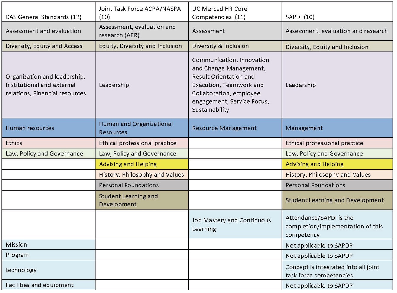 Using CAS’s general standards, ACPA and NASPA’s joint task force document on core competencies, and UC Merced’s Human Resources’ core competencies as a foundation, ten competencies (provided below) were created that offer staff the opportunity to develop knowledge, skills and attitudes expected of student affairs professionals regardless of their area of specialization or positional role within the field.